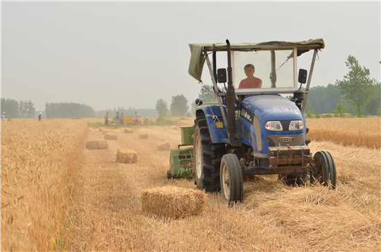 在韩庙村,小麦机收、秸秆打捆、秸秆清运同时进行。