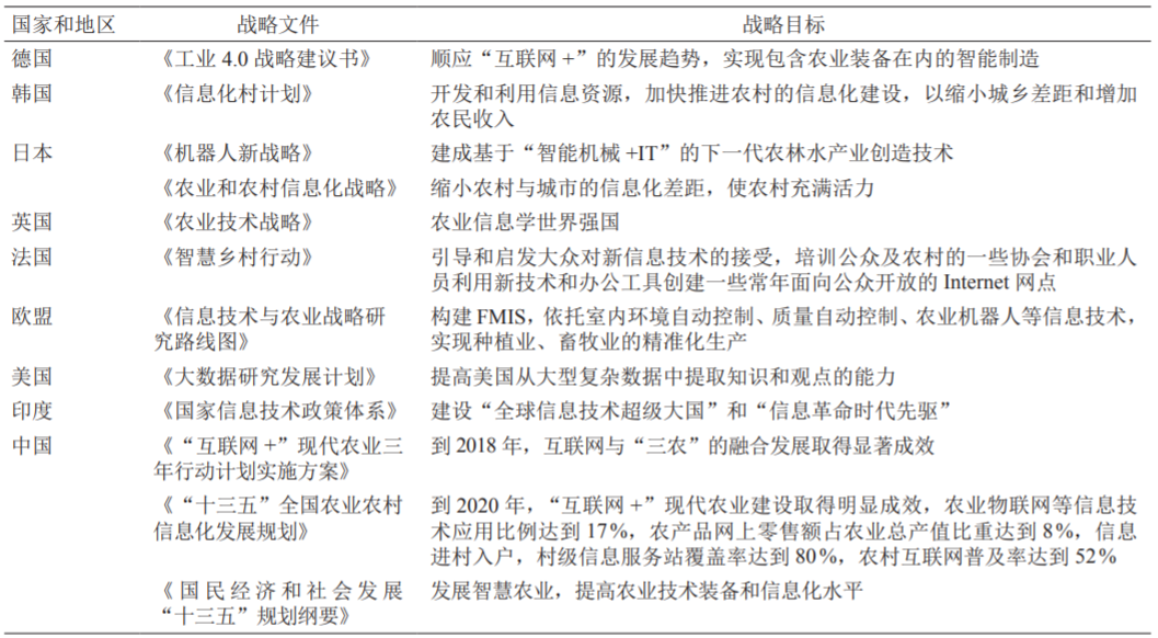 近年来,各国纷纷将“互联网+”现代农业发展作为本国农业建设的优先发展战略,出台了一系列重大战略措施(见表1)。2013年,英国政府发布了《农业技术战略》政策报告,将建立农业信息技术和可持续发展指标中心作为战略的基础和最先推行部分,强调英国今后对农业技术的投资将集中在大数据上,英国的农业科技实现商业化,并打造成农业信息学世界强国。2012年,欧盟出台了《信息技术与农业战略研究路线图》,提出通过农场管理信息系统(FMIS),在种植业、养殖业领域发展精准农业、精准畜牧产业,重点发展室内环境自动控制、农产品质量自动控制和农业机器人等农业信息化技术,提升农业管理效率。2015年,日本发布机器人新战略,提出将围绕农林水产业等主要应用领域,启动基于“智能机械+IT”的下一代农林水产业创造技术[1];2016年,投入40亿日元,开发20种不同类型的机器人以促进农场自动化。美国发起了网络与信息技术专项研究系列计划,布局机器人技术、先进制造业技术、生物监测等重点领域,利用自动控制技术和网络技术实现农业数据资源的社会化共享;2012年,美国政府公布了2亿美元的《大数据研究发展计划》,该计划提出通过提高美国从大型复杂数据中提取知识和观点的能力,加快科学与工程的研究步伐,加强国家安全。