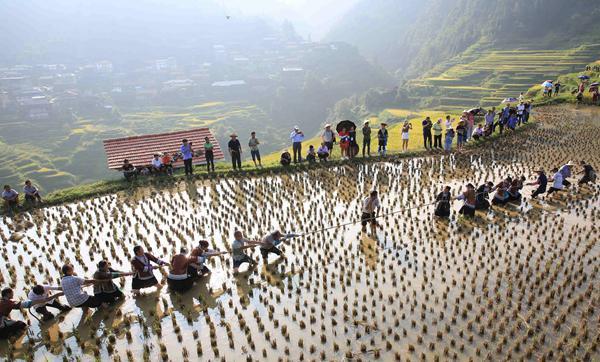9月15日,在广西融水苗族自治县杆洞乡花孖苗寨,人们在参加水田拔河比赛。