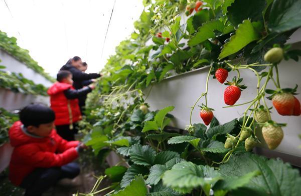 12月9日,游客在山东青岛市即墨区段泊岚镇即发现代农业基地温室大棚内采摘“立体草莓”。